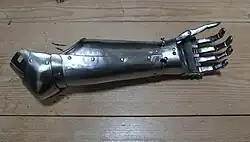 Prosthetics may not seem like a mechanical arm, but they are. It uses hinges and a wire harness to allow an incapable being to perform everyday functions. They have started creating arms that take a structure of a human arm and even though it looks like a skeletal metal arm, it moves like a normal arm and hand. This arm was made by Johns Hopkins University in 2015. It has 26 joints (way more than the old outdated arms) and is capable of lifting up to 45 pounds. This arm has 100 sensors that connect to the human mind. These sensors allow the person with the arm to move the arm like it was just another part of his or her body. People who have used this new prosthetic can say that they have actually been able to feel the texture, ultimately making prosthetics a huge part of the mechanical arm category.[7]