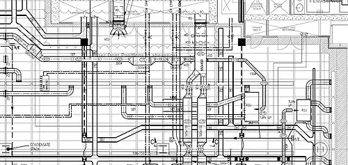 - Represent ductwork by either double or single line layouts as required to ensure that the routes indicated are feasible.
