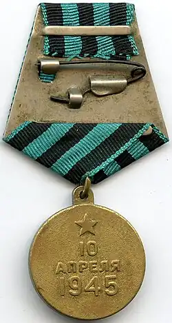 The Medal "For the Capture of Königsberg" (Russian: Медаль «За взятие Кёнигсберга») was a World War II campaign medal of the Soviet Union established on June 9, 1945 by decree of the Presidium of the Supreme Soviet of the USSR[1] to satisfy the petition of the People's Commissariat for Defense of the Soviet Union. It recognizes participation in the battle to capture the city of Königsberg from the armed forces of Nazi Germany. The medal's statute was amended on July 18, 1980 by decree of the Presidium of the Supreme Soviet of the USSR № 2523-X.[2]