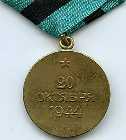 The Medal "For the Liberation of Belgrade" (Russian: Медаль «За освобождение Белграда») was a World War II campaign medal of the Soviet Union. It was established on June 9, 1945 by decree of the Presidium of the Supreme Soviet of the USSR[1] to satisfy the petition of the People's Commissariat for Defence of the Soviet Union.