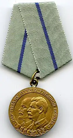 The Medal "To a Partisan of the Patriotic War"[2] (Russian: Медаль «Партизану Отечественной войны», Medal "Partizanu Otechestvennoi voiny") was a World War II Soviet paramilitary award established in two classes on February 2, 1943, by decree of the Presidium of the Supreme Soviet of the USSR.[1] to recognise the fortitude and courage of the partisans on the home front in their struggle to free the Soviet Motherland of the Nazi invaders far behind enemy lines. Its statute was amended by a further decree of the Presidium of the Supreme Soviet of the USSR on February 26, 1947.[3]