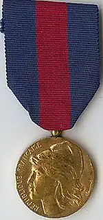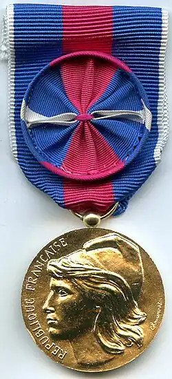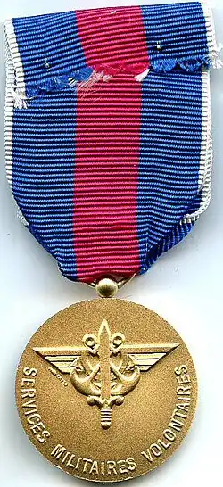 The Medal for Voluntary Military Service (French: "Médaille des services militaires volontaires") is a French military decoration established on 13 March 1975 by decree 75-150.[1] It was established in three grades to recognize voluntary military service in the reserves.[2]