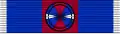The medal hangs from a ribbon passing through a suspension ring itself passing through a ball shaped suspension loop at the top of the medal. The 37mm wide silk moiré ribbon differs according to the grade of the award.[1] The ribbon of the bronze grade award is blue with an 11 mm central red stripe; the silver grade ribbon only differs from the bronze grade in the addition of white 2mm edge stripes; a rosette in the colours of the silver grade ribbon is added for the gold grade award.[1]