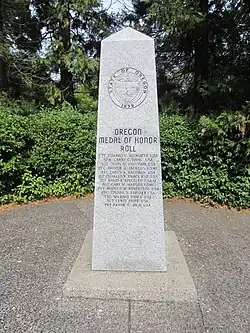 1. ^ a b "Oregon Medal of Honor Roll - Salem, Oregon - Specific Veteran Memorials on Waymarking.com". www.waymarking.com. Retrieved September 17, 2018.