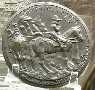 Unlike some of Pisanello's other portrait medals, such as those of Leonello d'Este,[9] the reverse of the medal of John presents no iconographic or allegorical mysteries. It shows the emperor on horseback, in profile to the right. Behind him, mounted on another horse, is a page or squire viewed from the rear and foreshortened. The emperor wears his distinctive hat and carries a bow on his left side and a quiver of arrows above his right leg. The double reins of the emperor's horse are visible and both horses possess elaborate straps over their hindquarters. The illustration conveys the arrest of a hunting expedition occasioned by John's encounter with a pedestalled wayside cross. The gesture of the emperor's raised right hand indicates his acknowledgement, in an act of piety, of the cross before him. The event takes place in a rocky landscape and is framed in the bottom portion by a Greek inscription: ἜPΓON • TÔV • ΠICÁNOV • ZΩΓPÁΦOV (‘The work of Pisano the painter’). This inscription is repeated in Latin within the top of the scene: OPVS • PISANI • PICTORIS.[10]