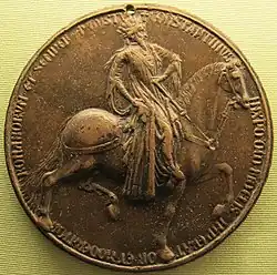 The medal of John VIII Palaeologus is a portrait medal by the Italian Renaissance artist Pisanello. It is generally considered to be the first portrait medal of the Renaissance.[1][2][3] On the obverse of the medal is a profile portrait of the penultimate Byzantine emperor, John VIII Palaeologus; the reverse contains an image of the emperor on horseback before a wayside cross. Although the date of the work is not clear it was likely to have been some time during 1438 and 1439, the years John was in Italy attending the Council of Ferrara (later moved to Florence). It is not known whether the emperor himself or his Italian hosts commissioned Pisanello to make the medal, but Leonello d’Este, the heir apparent to the marquisate of Ferrara, has been suggested as the most likely candidate.[4] Several drawings by Pisanello are closely associated with the medal and these include sketches now held in Paris and Chicago.