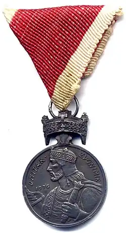 The Medal of the Crown of King Zvonimir (Croatian: Kolajna krune Kralja Zvonimira) was a decoration for military and civil achievements that benefit the Croatian people and the Independent State of Croatia. Croatian sculptor Ivo Kerdić created the medal, which has three grades: silver, bronze, and iron. It is named after King Demetrius Zvonimir of Croatia, who ruled during the 11th century and was known for being loyal to the Pope. The medal has two issues: Civil and Military. The Civil Issue has a white ribbon with red edges, while the Military Issue has a red ribbon with white edges. Decorations with oak leaves on the obverse signify acts of gallantry in action. The medal was awarded until May 1945, and was given to several Germans as well as Croatian nationals fighting on the Eastern Front and in the Balkans campaign.