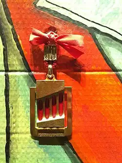 Recipients of the honour receive a medal in recognition; unlike for example the Catalonia International Prize, which comes with financial award but no designated honour. The medal resembles the Four Bars (which may be recognised as the Senyera with top-to-bottom stripes) and was based on a design created by Antoni Cumella i Serret in 1984.[a][2] In 2000, goldsmith Joaquim Capdevila i Gaya adapted the design so it could be produced as medals.[2]