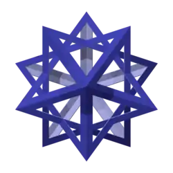 This solid is to the compound of small stellated dodecahedron and great dodecahedron what the convex one is to the compound of dodecahedron and icosahedron: The crossing edges in the dual compound are the diagonals of the rhombs. The faces have two angles of , and two of . Its dihedral angles equal . Part of each rhomb lies inside the solid, hence is invisible in solid models.