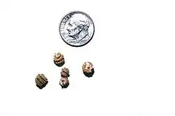 | Seed pods of Medicago noeana next to a U.S. dime for scale. | |