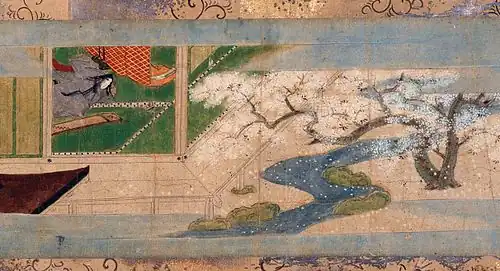 Works discussing the rejection of the material world, beginning with Saigyō at the end of the previous era, continued to be composed in the Kamakura period.[9] These works combined poetry describing the recluse life in thatched-hut retreats with magnificent essays called zuihitsu.[9] The most important examples are Kamo no Chōmei's Hōjōki and Kenkō's Tsurezuregusa which were written around the very end of the Kamakura period and the beginning of the Nanbokuchō period.[9] The former describes its author's journey toward giving up the world, social changes, and celebrates recluse life, while the latter is a work of instruction detailing its author's inner thoughts and feelings as he lives in quiet seclusion.[9] Along with the classical Pillow Book, they are considered the archetypal Japanese zuihitsu.[9]