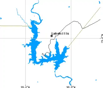 As part of the 2010–13 Southern United States drought, the lake water levels dropped below 5% capacity.[3] Many cracks, oil drums and a Jeep were visible as a result of low water.[4] Only one public boat ramp remained, located at Red Cove in Mico.[5] A few showers in the Summer of 2013 helped the lake rise to 5.2%, but the dam was reopened in September as many people in the South Side of San Antonio use the lake for a water source. Many businesses have closed in the area, many residents have left and Lakehills has become somewhat of a ghost town.[6][7]
