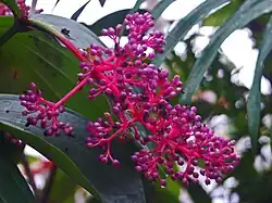 Blossoms and leaves of Medinilla speciosa