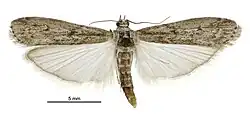 Adult Mediterranean flour moths have pale gray bodies. Their forewings are gray with black zigzag markings while the hindwings are an off-white color.[4] The wingspan is 1.5-2.6 cm.[2] Larvae (caterpillars) are white or pink with black spots and dark heads. Pupae are reddish brown.[4] Meyrick - Forewings fuscous, irrorated with whitish and sprinkled with dark fuscous; lines hardly paler, first posteriorly dark-edged, nearly straight, rather oblique, serrate-indented above middle and near dorsum, second strongly indented near costa, dark-edged, with darker dots on veins; two blackish transversely placed discal dots. Hindwings whitish, veins and termen fuscous, in male without whitish ochreous hair-tufts.[5][6][7][8]