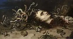 The story of Medusa originates from Greek Mythology where Medusa is a Gorgon monster, which is portrayed in Rubens' rendition.[6] Medusa was raped in a sacred shrine dedicated to Minerva by Neptune.[8] Minerva turned Medusa's hair into snakes as revenge for the violation of her shrine, which is portrayed in Rubens' portrayal of her.[8] Medusa was thought to be an apotropaic symbol that would protect from and banish evil.[1] She has been compared to the modern evil eye.[6] Iconographers at the time such as Cesare Ripa and Lodovico Dolce as well as Rubens portrayed her as such.[1] She was thought to be a symbol of evil to ward off evil.[9] Medusa is attributed to both evil and as a symbol of power, as portrayed in Rubens' interpretation.