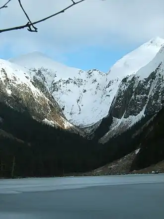 Looking up from the Medvejie Lake valley from near the end of the frozen-over lake | |