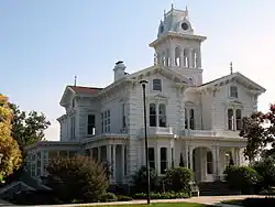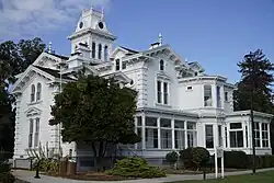 The 7,902-square-foot (734.1 m2) mansion contains somewhere between 23 and 27 rooms (sources vary[2][3][10]) located on three above-ground levels, with a cupola on the third floor.[6][8] The home also contains a basement below-ground which has an "unusual" bracing system consisting of thick, diagonally placed timber boards.[11] Having a bracing system such as this was uncommon for many area buildings, but was a wise move due to the faults in the area.[11] Other architectural assets it includes is "a mansard roof, a bull's-eye window in the central tower and paired, arched windows".[6] As of 2006, local historians were still unsure of who designed and built the home.[11]