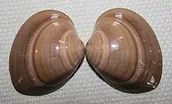 The valves are thick and of equal size. In life, the valves are covered by a grayish-brown periostracum. The external surface of the shell is smooth. It is tan to brown in color, sometimes with bands or speckles of different intensity. The interior of the shell is white, sometimes with bands of purple.[4] The shell can reach 120 millimetres (4.7 in) long, 97 millimetres (3.8 in) wide, and 68 millimetres (2.7 in) deep. Weight may reach 93 grams (3.3 oz) for live individuals.[5][6]