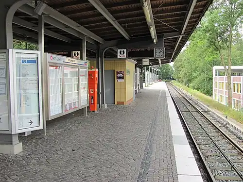 Originally, near the station, a third track without a platform was located. Built for goods transports of Altrahlstedt-Wohldorfer Kleinbahn (local railway), it was later dismantled at Meiendorfer Weg station. Further south, near Berne station, it was re-built and used for brake tests and other U-Bahn test driving starting from Farmsen railway workshop.[1]