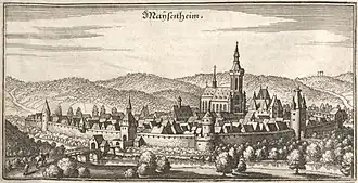 Meisenheim is believed to have arisen in the 7th century AD, and its name is often derived from the town's hypothetical founder "Meiso" (thus making the meaning "Meiso's Home"). In 1154, Meisenheim had its first documentary mention. Sometimes cited as such, however, is a document dated 14 June 891 from the West Frankish king Odo (for example by K. Heintz in Die Schlosskirche zu Meisenheim a. Gl. u. ihre Denkmäler in Mitteilungen d. Histor. Vereins d. Pfalz 24 (1900) pp. 164–279, within which p. 164, and by W. Dotzauer in Geschichte des Nahe-Hunsrück-Raumes (2001), pp. 69 & 72), but this document is falsified (cf. H. Wibel: Die Urkundenfälschungen Georg Friedrich Schotts, in Neues Archiv d. Ges. f. Ältere Dt. Gesch.kunde Bd. 29 (1904), pp. 653–765, within which p. 688 & pp. 753– 757[5]). In the 12th century, Meisenheim was raised to the main seat of the Counts of Veldenz and in 1315 it was granted town rights by King Ludwig IV. On what is now known as Schlossplatz ("Palace Square"), the Counts of Veldenz built a castle, bearing witness to which today are only two buildings that were later built, the Schloss Magdalenenbau (nowadays called the Herzog-Wolfgang-Haus or "Duke Wolfgang House") and above all the Schlosskirche ("Palace Church"), building work on which began in 1479. Both buildings were built only after the Counts of Veldenz had died out in 1444 and the county had been inherited by the Dukes of Palatine Zweibrücken. This noble house, too, at first kept their seat at Meisenheim, but soon moved it to Zweibrücken. From 1538 to 1571, Duke Wolfgang of Zweibrücken maintained in Meisenheim a mint, with one interruption, although this was then moved to Bergzabern. The Doppeltaler (double Thaler), Taler (Thaler) and Halbtaler (half Thaler) coins minted in the time when the mint was in Meisenheim remain among the highest-quality mintings from Palatinate-Zweibrücken.