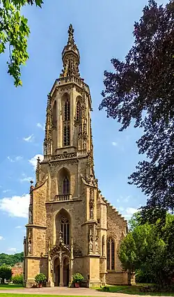 The Evangelical Schlosskirche (“Palace Church”), a three-naved hall church, was built between 1479 and 1504. At the time of building, it stood right next to the Schloss and was the estate church, the town parish church and the Knights Hospitaller commandry’s church. Its Late Gothic west tower is shaped by rich stonemasonry. In the grave chapel, the 44 mostly Renaissance-style tombs of the House of Palatinate-Zweibrücken and the rich Gothic rib vaulting bear witness to sculptors’ highly developed art; also often praised is the wooden Rococo pulpit. The organ restored in 1993/1994 on the west gallery with its Baroque console was completed in 1767 by the renowned Brothers Stumm, and was already at the time, with its 29 stops, 2 manuals and pedal, one of the most opulent works of organ building in the Middle Rhine region. Together with the organ at the Augustinian Church (Augustinerkirche) in Mainz, it is one of the biggest preserved instruments built by this Hunsrück organ-building family.
