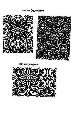 The dress of the women consists of a striped cotton or silk cloth passed round the body under the armpits and over the breast, a jacket, and a sheet.[1] The dress of the women when of good quality is picturesque and pleasing. During the hot weather, it consists of a piece of cloth open except at the bottom, where it is stitched together by the edges for a few inches; this is folded round the body, under the armpits and over the breast, and tucked in by the hand at the side of the body. In length, it reaches the ground, but as this would be inconvenient in walking, it is hitched up about halfway to the knee, and tucked in again at the waist.[1] This piece of cloth, called a fanek or phanek, is only wide enough to go one and a half times round the body; this gives enough room, however, for the legs in walking. The phanek or fanek (Meitei: ꯐꯅꯦꯛ) is made in cotton and silk, and the only patterns are stripes of various colours and widths running across the material, the groundwork being of different colours. The commoner patterns are red with green stripes, green and black, blue with black and white stripes, yellow and brown, dark blue with green and white stripes, etc. At the top and bottom of the garment is a broad margin, on which geometrical figures or patterns of various kinds are sewn by hand with floss silk in various colours. Over the phanek or fanek is worn a white sheet, which is folded in the usual native manner, the face, however, being left uncovered. In the cold season a short jacket with long sleeves is worn; this reaches below the bust over the phanek or fanek, and is worn tight fitting. The material is usually velvet or satin, black, blue, or green being the favourite colours. Female children, until puberty, or near it, wear the phanek or fanek round the waist, the upper part of the body being bare.[1]