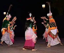 The religious festivals, such as the Lai Haraoba (Meitei for 'making merry with the gods') (Meitei: ꯂꯥꯏ ꯍꯔꯥꯎꯕ), are occasions when the sumptuary laws are a little relaxed, and women don their gayest apparel without let or hindrance. Those who have been selected to take a part in one of the religious dances wear a handsome costume which is as modest as it is also beautiful, and which is sanctioned by long custom for these occasions. Old women make a living by hiring out these costumes, for they cost too much for ordinary purses to buy outright. Many children usually take roles of deities, by wearing handsome dresses with resplendent head-gears, adorned with peacocks' feathers and silver tinsels.[1]