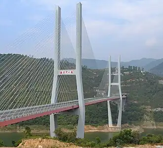 The Meixi River Expressway Bridge is a cable-stayed bridge near Fengjie, Chongqing, China.[2] The bridge opened in 2010 carrying traffic on the G42 Shanghai–Chengdu Expressway across and spans 386 metres (1,266 ft) across the Meixi River. The bridge sits 145 metres (476 ft) above the original river level but the construction of the Three Gorges Dam has increased the height of the water below the bridge and the full clearance is no longer visible.
