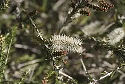 The flowers are white to cream coloured and arranged in spikes on the sides of the branches. Each spike is up to 15 mm (0.6 in) in diameter and contains 8 to 50 individual flowers. The petals are 1.7–2.1 mm (0.07–0.08 in) long and usually fall of as the flower opens. The stamens are arranged in five bundles around the flowers and there are 10 to 16 stamens in a bundle. Flowering occurs between July and January and is followed by fruit which are woody capsules 2–3.3 mm (0.08–0.1 in) long in roughly cylindrical clusters along the stems.[2][3]