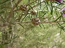 The flowers are a shade of pink or purple and arranged in heads at the ends of branches which continue to grow after flowering and sometimes also in the upper leaf axils. The heads are up to 20 mm (0.8 in) in diameter and contain 3 to 8 groups of flowers in threes. The petals are 0.9–2 mm (0.04–0.08 in) long and fall off as the flowers open. The stamens are arranged in five bundles around the flower, each bundle with 2 to 8 stamens. Flowering time varies with subspecies but in general occurs in spring and summer. The fruit are woody capsules 2.5–3.5 mm (0.098–0.14 in) long, in spherical clusters up to 20 mm (0.8 in) in diameter.[2][3]