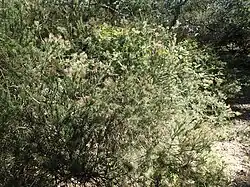 Melaleuca subulata is a shrub growing to 1–2 m (3–7 ft) high with hard, fibrous bark. Its leaves are arranged alternately and are 18–50 mm (0.7–2 in) long, 1–3.1 mm (0.04–0.1 in) wide, cylindrical or shaped like a bradawl.[4][5]