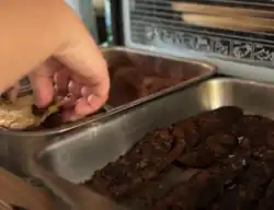 Numerous distinct versions exist across the region.[3] In a basic preparation, eggplant slices are coated in flour and fried, before being dredged in eggs and flour for a second fry. The dish is constructed by layering the eggplant slices with chocolate and fillings such as pine nuts, candied fruits (particularly citron), raisins, and almond pieces. It is typically served chilled or at room temperature.[3][1]