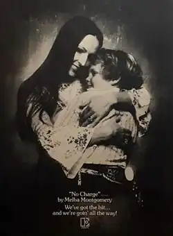 In 1974, songwriter Harlan Howard brought Montgomery a song he had reportedly written especially for her called "No Charge".[21] The song was written from the point of view of a mother who tells her child how she has cared for him without ever being paid for her domestic responsibilities.[22] Her performance on the song's recording reportedly made studio musicians weep while they were playing it.[1] The single topped the Billboard and RPM country charts around Mother's Day in May 1974. It became her first (and only) number-one song in her career.[7][19] It also climbed into the top 40 of the Billboard Hot 100 and the RPM Top Singles chart.[23][24] Elektra issued Montgomery's studio album of the same name in April 1974, which reached number 14 on the Top Country Albums survey.[9] The song's commercial success elevated her solo career. She appeared on both The Mike Douglas Show and The Midnight Special in 1974. She also played several venues that attracted pop audiences. "I'm delighted 'No Charge' hit the pop charts, but we cut it as country," Montgomery reflected in 1974.[18]