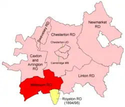 The district had its origins in the Royston Rural Sanitary District. This had been created under the Public Health Acts of 1872 and 1875, giving public health and local government responsibilities for rural areas to the existing boards of guardians of poor law unions.[2] Under the Local Government Act 1894, rural sanitary districts became rural districts from 28 December 1894. Where rural sanitary districts straddled county boundaries, as Royston Rural Sanitary District did, they were to be split into separate rural districts in each county, but with provision that the relevant county councils could agree variations to this general rule with the approval of the Local Government Board. A joint committee of Cambridgeshire, Essex, and Hertfordshire County Councils considered the question of the Royston Rural Sanitary District during 1894 prior to the Local Government Act coming into force, and agreed that the three Essex parishes in the sanitary district should not form a rural district on their own, but should be included in a rural district with the Cambridgeshire parishes, which would be called the Melbourn Rural District.[3][4]
