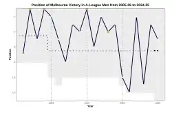 The 2007–08 season proved to be another disappointment with Victory narrowly missing the finals.[24] Hindered by multiple injuries throughout the season and the inexperience of time & energy management whilst trying to compete in the club's inaugural AFC Champions League campaign of 2008 at full strength, Melbourne narrowly missed the finals but the season did bring long term positives. The acquisition of future team of the decade players Carlos Hernández, Matthew Kemp, and Tom Pondeljak would ensure on-field strength for next three seasons. The 2008–09 season brought more success for the club in achieving its first treble. The last A-League Pre-Season Challenge Cup of 2008,[25] finishing top of the ladder as premiers resulting in qualifying a second time in the AFC Champions League for the 2010 campaign, and being crowned champions after defeating Adelaide United a second time in a grand final in front of a crowd of 53,273, which as of January 2019, is still the second largest attendance for an A-League grand final behind the 2007 final.[26] The 2009–10 season saw Victory be serious competitors for first position but would ultimately and narrowly finish behind Sydney FC, whom Victory would lose 2–4 on penalties in the grand final weeks later. It would prove to be the last grand final for manager Ernie Merrick and for Kevin Muscat as captain, with Victory finishing fifth for the 2010–11 season, and losing to Gold Coast in first round of the finals.