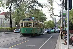 A section of Chapel Street was first served by a cable tram line opened in 1888, which ran from Brighton Road to Toorak Road, then turned towards St Kilda Road and into the CBD.[1] Between 1924 and 1926 the cable tram line was converted to electric traction by the Melbourne & Metropolitan Tramways Board, and was extended along Church Street, forming the route as it operates today.[2] It ran with two variations: route 79, turning from Chapel Street along Carlisle Street to St Kilda Beach, and route 77, which turned from the southern part of the route at Swan Street and continued into the city. The latter route was discontinued in November 1986.[3]