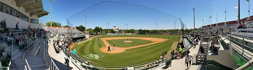 Player amenities include home and visiting locker rooms, coaches' offices and a covered batting cage area. The field itself features natural grass and symmetrical outfield dimensions. An electronic scoreboard is located beyond the left field fence.