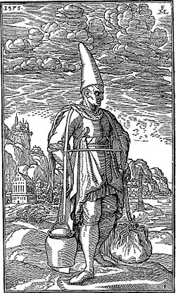 What happened to the artist as well as to the large stock of woodblocks for the publication by the time he disappears from the records in 1583, is not known. Two copies of a prototype title page for the publication exist, both initially from 1575, and each with an inserted title on top with the same text (Wolgerissene und geschnittene Figuren in Kupffer und Holz durch. Den Kunstreichen und weitberümten Melcher Lorch für die Mahler Bildthawer und Kunstliebenden. an tag gegeben) and the same date, but in different print type.[20] Whereas this 1619-edition never to have come into fruition, 7 years later the woodcuts were published in Hamburg, with the same title. It is therefore possible that the blocks had been in Hamburg ever since Lorck's death. The leading Lorck-scholar, Dr. Erik Fischer, the former keeper of the Copenhagen Printroom, suggests that the Turkish Publication came out only as a torso of what it was intended to be. In the re-publication of the woodcuts from 1646, a register of the motifs was attached, however it does not fit the prints and it points to an "original" where more can be learned. It is Dr. Fischer's thesis that that "original" was a written manuscript that would supplement the woodcuts and thus fulfil the promise given in the 1574 Soldan Soleyman... of a thorough description of Turkish society, life and customs. This idea is corroborated by the context in which the woodcuts are reused in another Hamburg-based publisher, Eberhard Werner Happel s bulletins on the Turkish wars of the 1680s and descriptions of Turkish society. Here, bits of descriptions turn up that, according to Dr. Fischer's thesis, could have been taken from a text very closely connected to the woodcuts and based on personal experience with the Turks, i.e. a text by Lorck himself.[21]
