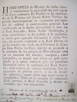 In 1808, after the French invasion of Spain, the Criollos and some of the Spanish living in New Spain wanted to proclaim the independence of the colony and establish a governing junta, similar to the anti-French juntas in the mother country. On September 1, 1808, Talamantes delivered two tracts to the Ayuntamiento, in favor of separation from Spain and of the convoking of a Mexican congress. These tracts, Congreso Nacional del Reino de Nueva España (23 August 1808) and Representación Nacional de las Colonias, Discuso Filosófico (25 August 1808) argue that Spain had lost its sovereignty and that New Spain had the right to repossess it.[3] His premises were that all ties to Spain had now been broken; that regional laws had to be made, independently of the mother country; that the Audienciacould not speak on behalf of the king; and that the king having disappeared, sovereignty was now vested in the people. His proposed congress was to represent all the provinces of New Spain. It was to be invested with the legislative authority of the new government. The courts already established were to exercise the judicial power, and Viceroy Iturrigaray was to be captain general (commander of the military) and, provisionally, chief executive. This was the government of a republic; there was no provision for a king.