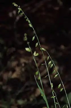 Spikelets are 8–10 millimetres (0.31–0.39 in) in length and are oblong. They also have fertile florets which are diminished at the apex. Both lower and upper glumes are elliptic, are 7 millimetres (0.28 in) long, and either gray or red in colour. Both are also keelless and 5-veined with obtuse apex. Lemma is chartaceous, elliptic, and is 3–3.5 millimetres (0.12–0.14 in) long. It is also shiny and keelless but have 3 veines. The lemmas apex is obtuse just like glumes,[2] with palea being 2-veined, lanceolated, and 5–5.5 millimetres (0.20–0.22 in) in length.[4] Flowers are fleshy, oblong, truncate and grow side by side, with 3 anthers. Fruits are caryopsis, have adherent pericarp and are 2 millimetres (0.079 in) long.[2]
