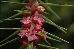 Melichrus erubescens, commonly known as ruby urn-heath,[2] is a flowering plant in the family Ericaceae and is endemic to eastern Australia. It is a slender to compact, bushy shrub with mainly erect, glabrous leaves, pink to deep red flowers and more or less spherical, red drupes.
