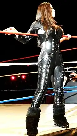 While managing the Tag Team Champions, Melina's character was developed to be more egotistical, as she declared herself "the most-dominant Diva in WWE".[4] She made her official in-ring debut on June 30 against Michelle McCool, and had her first pay-per-view match against Torrie Wilson at The Great American Bash in a bra and panties match, winning both matches.[29][30] In the same night, MNM dropped their championships to the Legion of Doom, prompting a new storyline where Melina hired Jillian Hall, a fixer, to assist them.[30][31] MNM regained the titles on October 28 in a fatal four-Way tag team match.[32] On the Eddie Guerrero Tribute Show, Melina won a Divas battle royal by eliminating the Women's Champion Trish Stratus.[33] The next week, as a part of a new storyline, MNM kidnapped Stratus, tied her up and gagged her for Melina, who then challenged her to a match for the Women's Championship.[34] The two fought at Survivor Series, with Melina losing to Stratus with the help of Mickie James.[35]