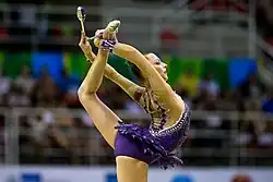 On June 17–19, Staniouta competed at the 2016 European Championships and finished in 4th place with a total of 73.715 points.[26] Two weeks later, she performed at the 2016 Berlin World Cup and won the all-around silver with a total of 73.900 points behind Russia's Dina Averina. Staniouta qualified to all apparatus finals and won gold in hoop, tied with Ganna Rizatdinova, silver in ball and clubs, and bronze in ribbon, tied with Salome Pazhava.[27] On July 8–10, Staniouta then finished 5th in the all-around at the 2016 Kazan World Cup with a total of 74.150 points behind Korea's Son Yeon-Jae. She won silver in the ribbon final and bronze with ball and clubs.