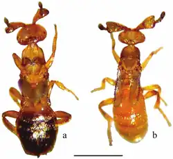 Melittobia wasps are gregarious ectoparasitoids[2] on solitary bees, honeybee[3] and wasps, and also of any insect cohabitants of their hosts' nests, such as Coleoptera, Lepidoptera and Diptera.[4] One species has been reared from puparia of Anastrepha fruit flies collected from fallen fruits in Mexico.[5] They show intrasexual and intersexual dimorphism, with the males being blind and flightless and two castes of females, one long winged and one short winged, which are probably determined by nutrition. The females exhibit primitive social traits[6] while the males are competitive, ferociously fighting and killing their male siblings. The males attract the females using a pheromone and they have an elaborate courtship ritual. They have a skewed sex ratio with 95% of the offspring being females which are from fertilised eggs but males are produced asexually through arrhenotoky.[4] The females have overlapping adult generations and show close ties of kinship, parental care and altruistic cooperative escape behaviors. The best studied species from which most of the information about these wasps has been derived are Melittobia acasta, Melittobia australica and Melittobia digitata.[6] These wasps are potentially economically harmful due to their lack of host specificity, fecundity, cryptic behaviour and behavioural flexibility. They have a rapid life cycle of 25 days.[4] They breed well in the laboratory and are seen as potential model organisms in the study of genetics, developmental biology and ethology.[6]