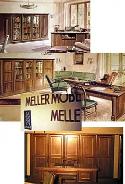 On 5 July 1962, Gerhard Kohnert died, after 53 years of running the company as General Manager. At its peak, the company had 200 employees and was a significant part of the East Westphalia Furniture industry.[10] His brother Hans Kohnert from Bremerhaven then took over the management of the company. However, he could not stop the economic decline. At the insistence of the house banks, Hans Kohnert sold the Meller Möbelfabrik to the main creditors in 1967 in order to avoid bankruptcy. The new managing partners,[11] Hans Wilhelm Rottmann (co-owner of the Rottmann chipboard factory in Herford) and Heinrich Fortmann (previously authorised signatory and operations manager at MMM), initially succeeded in bringing about an economic upswing at MMM. However, in the long run the disadvantages of the outdated factory buildings (three-storey and winding) could not be compensated for even by various rationalisation measures. The capital was not sufficient to reduce the large investment backlog. New competitors also made it increasingly difficult to hold one's own in the market and to achieve the necessary prices.