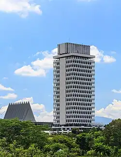 Parliament first sat at the former headquarters building of the Federated Malay States Volunteer Force on a hill near Jalan Tun Ismail (Maxwell Road). The Dewan Negara met in a hall on the ground floor while the Dewan Rakyat met in the hall on the first floor.[1] With the completion of Parliament House in 1962, comprising a three-storey main building for the two houses of Parliament to meet, and an 18-storey tower for the offices of Ministers and members of Parliament, both houses moved there.