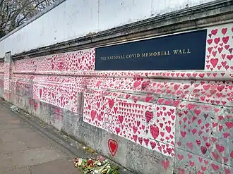 The National Covid Memorial Wall is a wall in London, along the South Bank of the River Thames. Started in March 2021, it stretches for over 500 metres and is filled with over 150,000 red hearts hand-painted by volunteers. Each heart represents a person who died with COVID-19 on their death certificate.[1]
