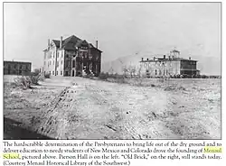 Menaul School, located in Albuquerque, New Mexico, was founded in 1896 by the Presbyterian Church as part of its mission education efforts, specifically to provide education to Spanish-speaking New Mexican youth. The school was originally called the Menaul Training School, named for the Reverend James Menaul, who had acquired funding for the site from the Presbyterian Church.[1]