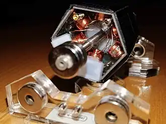 The motor consists of a rotor shaft with an array of (typically four to eight) solar panels and electromagnetic coils arranged in a barrel shape around the centre of the shaft; this rotor is horizontally mounted in a frictionless radial bearings over a central magnet on the base plate of the motor. The final 6th degree of freedom, the axial or thrust direction, is not levitated, but rather supported by a steel ball point of contact (low friction).