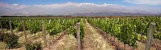 Mendoza Province is Argentina's most important wine region, accounting for nearly two-thirds of the country's entire wine production. Located in the eastern foothills of the Andes, in the shadow of Aconcagua, vineyards are planted at some of the highest altitudes in the world, with the average site located 600–1,100 metres (2,000–3,600 ft) above sea level. The principal wine producing areas fall into two main departments-Maipú and Luján, which includes Argentina's first delineated appellation established in 1993 in Luján de Cuyo. The pink-skinned grapes of Criolla Grande and Cereza account for more than a quarter of all plantings but Malbec is the region's most important planting, followed closely by Cabernet Sauvignon, Tempranillo and Chardonnay.[1] Mendoza is considered the heart of the winemaking industry in Argentina with the vast majority of large wineries located in the provincial capital of Mendoza.[2][3]